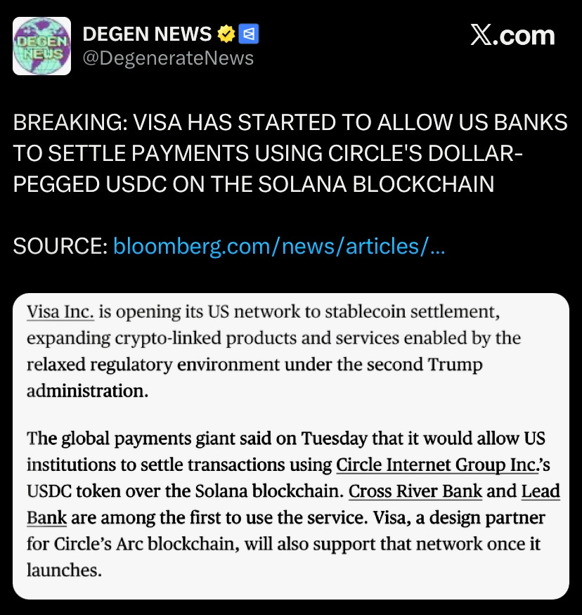 Visa will offer stablecoin settlement for banks using USDC on Solana