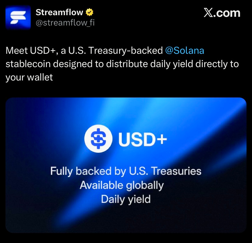 Streamflow announced launch of USD+, a yield bearing stable-coin backed by the US treasury on Solana powered by M0
