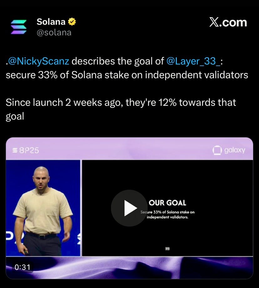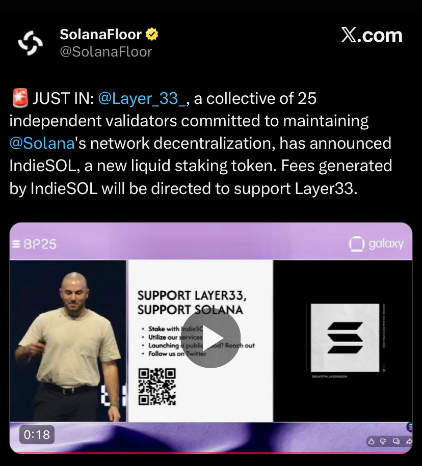 Solana Decentralized Validator Network, Layer33 announced liquid staking token, IndieSOL. At breakpoint, they also announced plans to secure 33% of Solana stake on Independent validators
