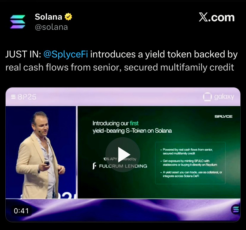 Solana RWA project, Splyce Finance introduced SFULC, a yield bearing token on Solana powered by Fulcrum lending