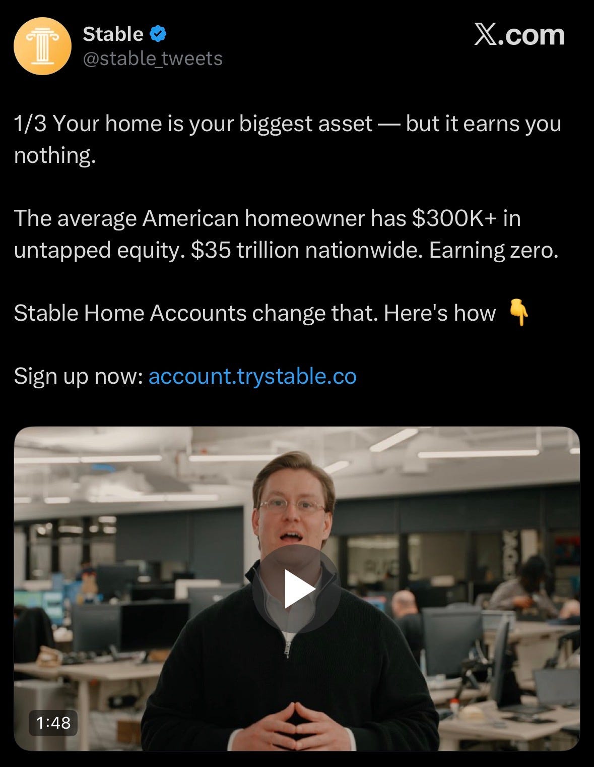 Stable launched Home Accounts, letting homeowners unlock liquidity by depositing property to generate liquidity for USDX, mortgage-backed stablecoin, while retaining ownership.