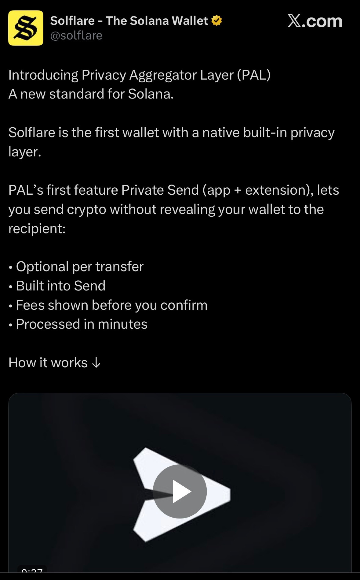 Solflare launched Privacy Aggregator Layer (PAL), enabling private crypto transfers
