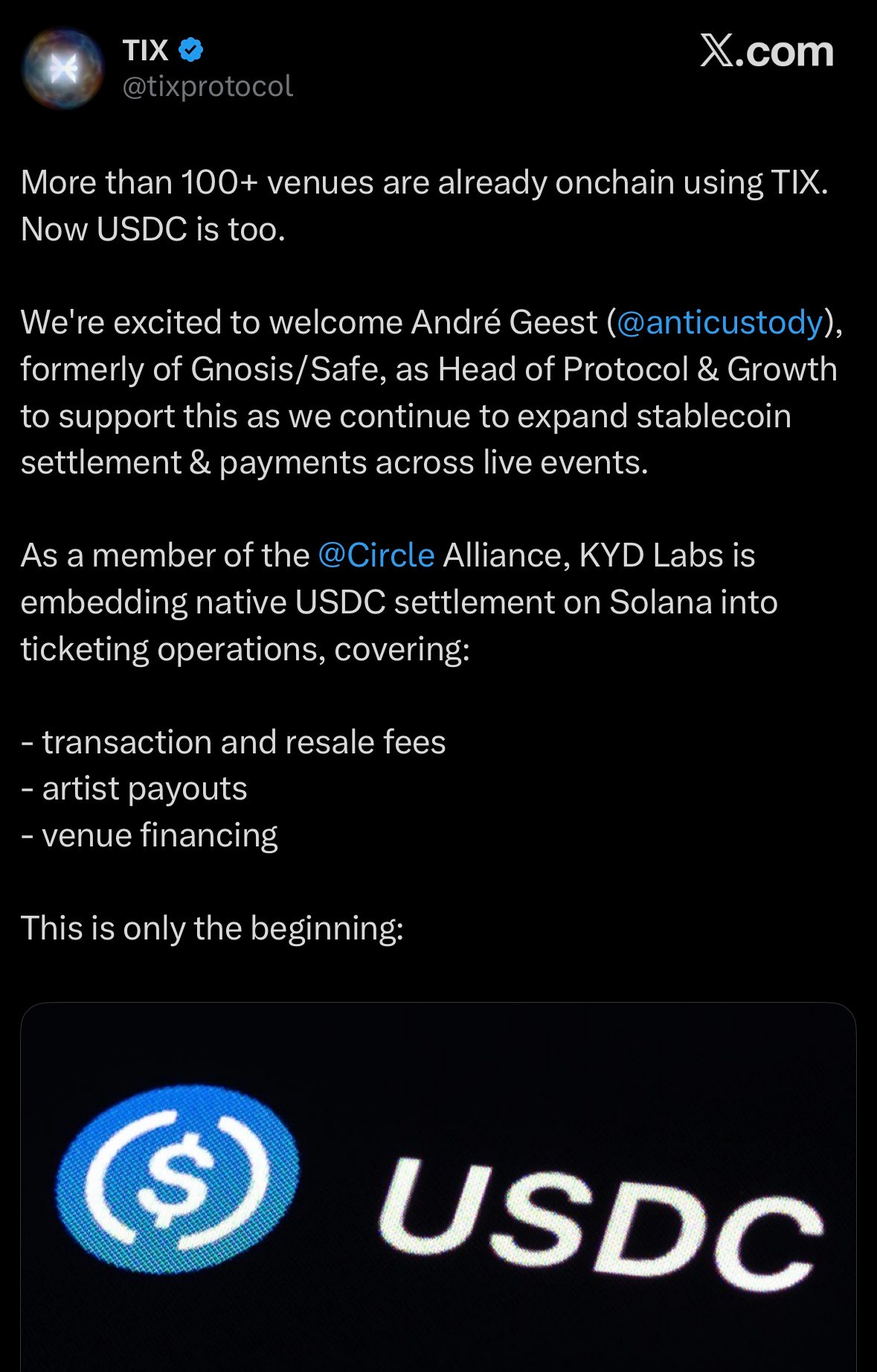 TIX protocols added USDC for onchain ticketing, hires André Geest to drive growth