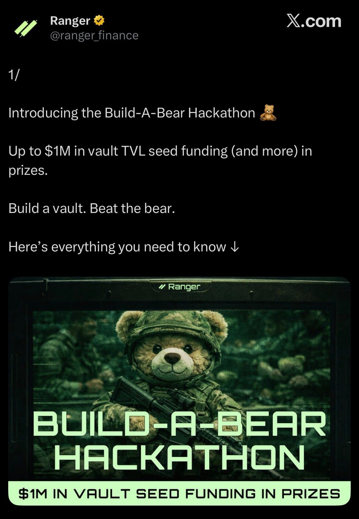 Ranger launched Build-A-Bear hackathon, offers $1M+ in prizes for developers building deployable vault strategies on Ranger Earn.