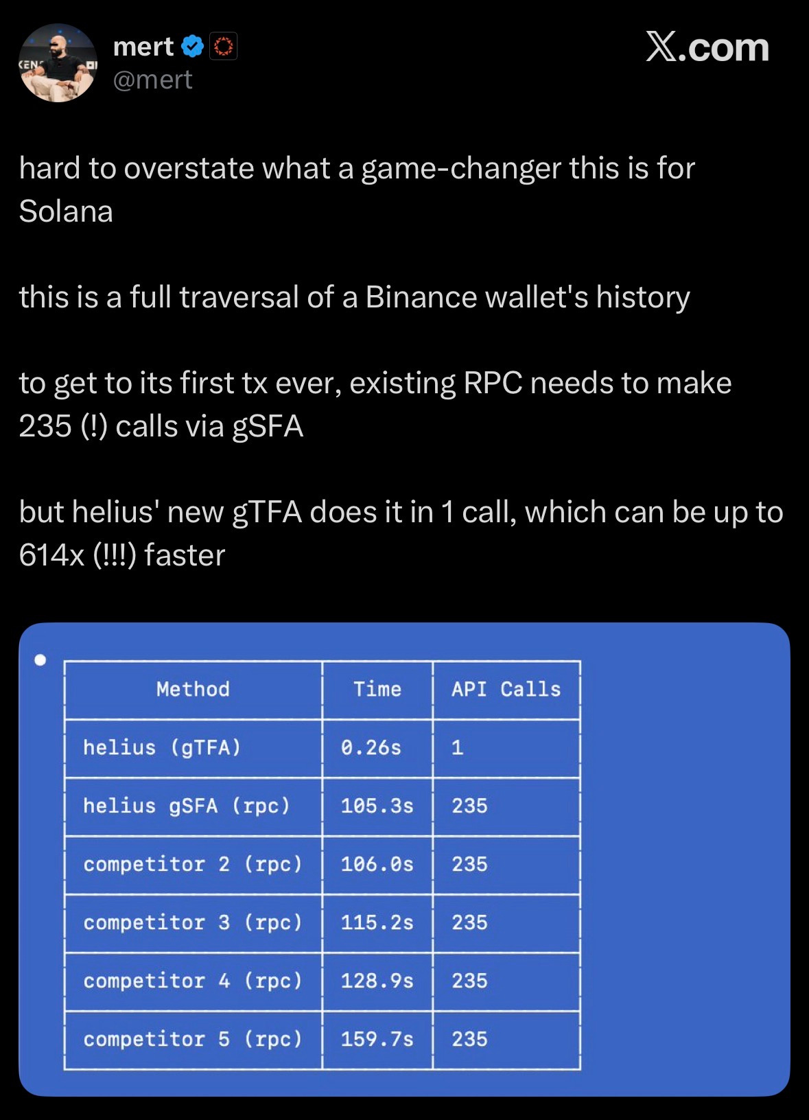 Helius gTFA API can retrieve a Binance wallet’s entire transaction history in a single call, up to 614× faster than traditional RPC methods.