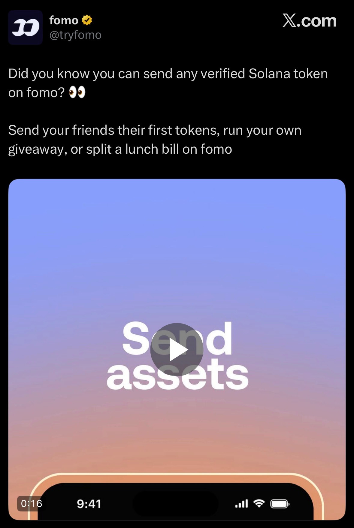 Fomo announced users can send verified Solana tokens to friends, run giveaways, or split bills, enabling easy p2p token transfers.