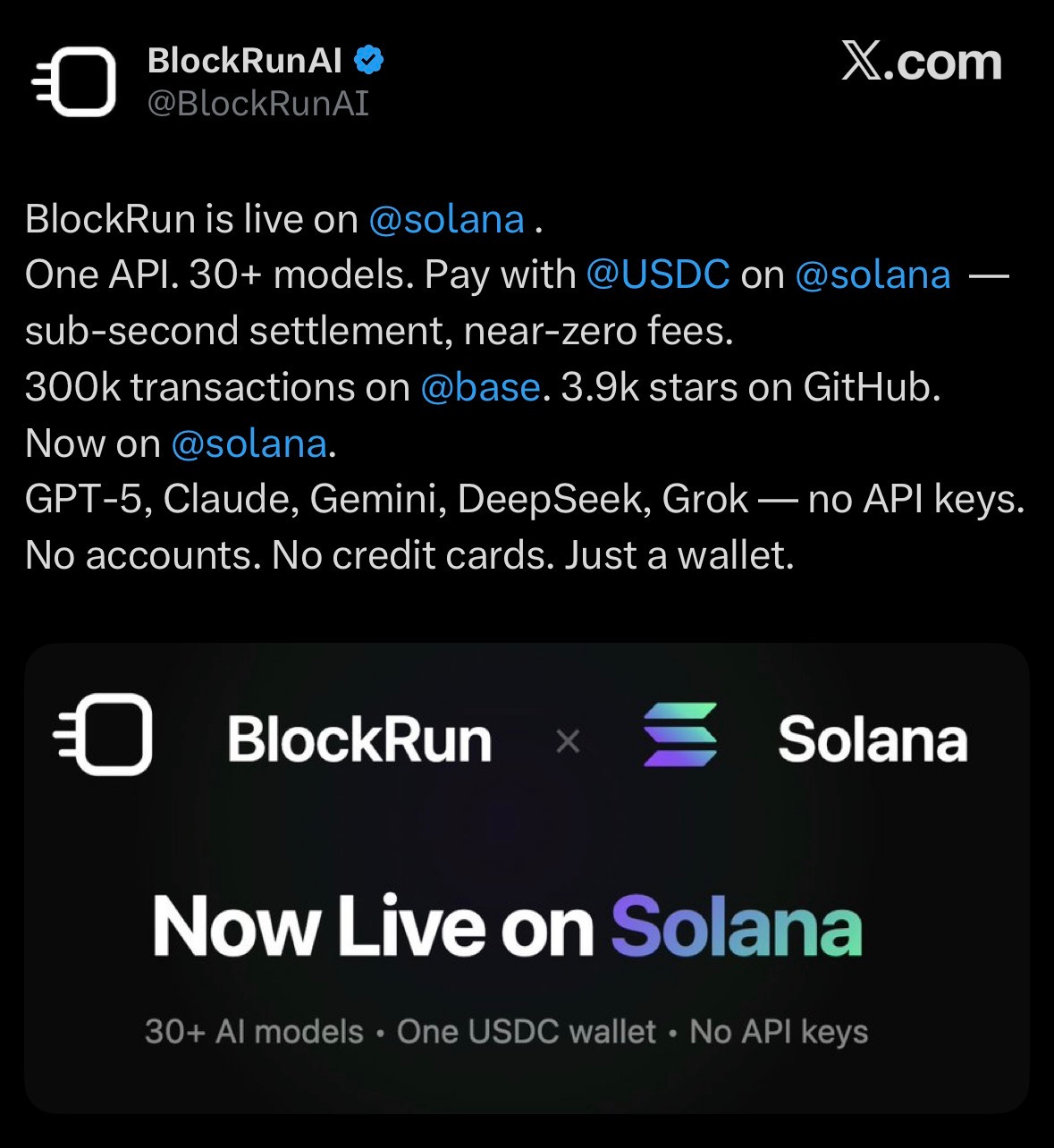 Block Run AI launched on Solana, providing 30+ AI models via one API with near-zero-fee USDC payments, accessible with just a wallet.