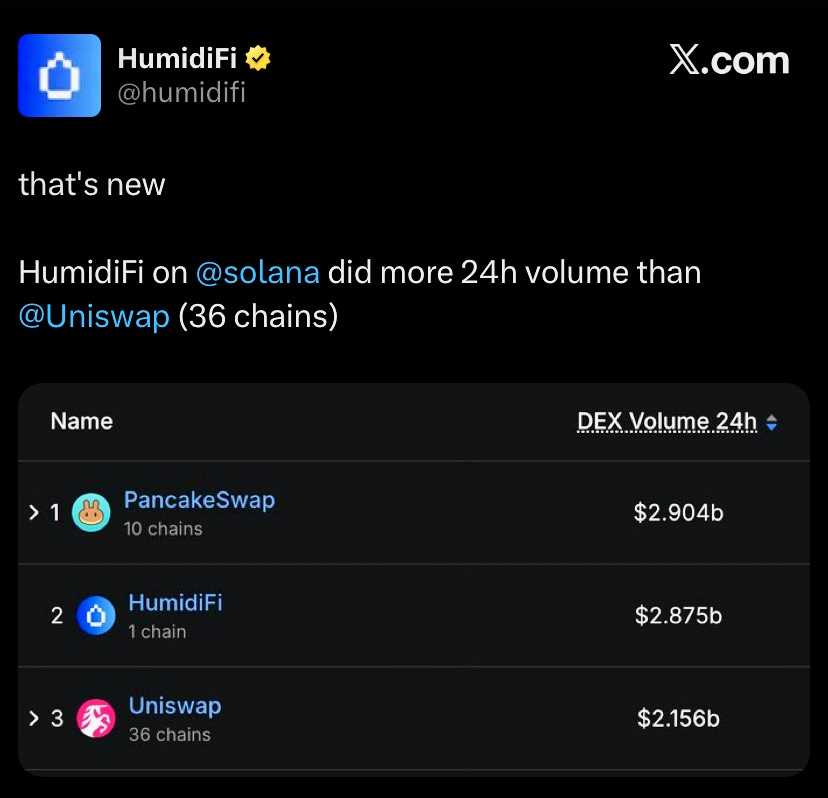 Humidifi continues to lead all Solana DEXs in weekly trading volume, surpassing Meteora and Raydium