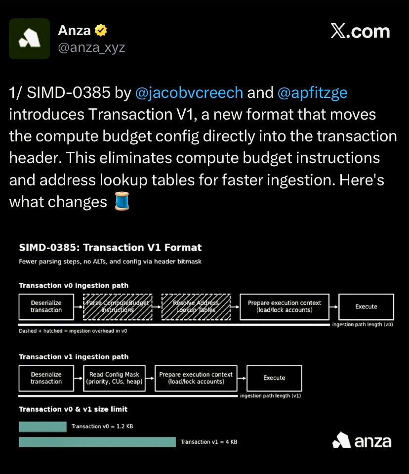 Solana devs introduced SIMD-0385 eliminating compute budget instructions by embedding priority fees, compute limits, and heap size directly in the transaction header, enabling faster ingestion, supporting up to 4KB transactions, and removing the need for address lookup tables.
