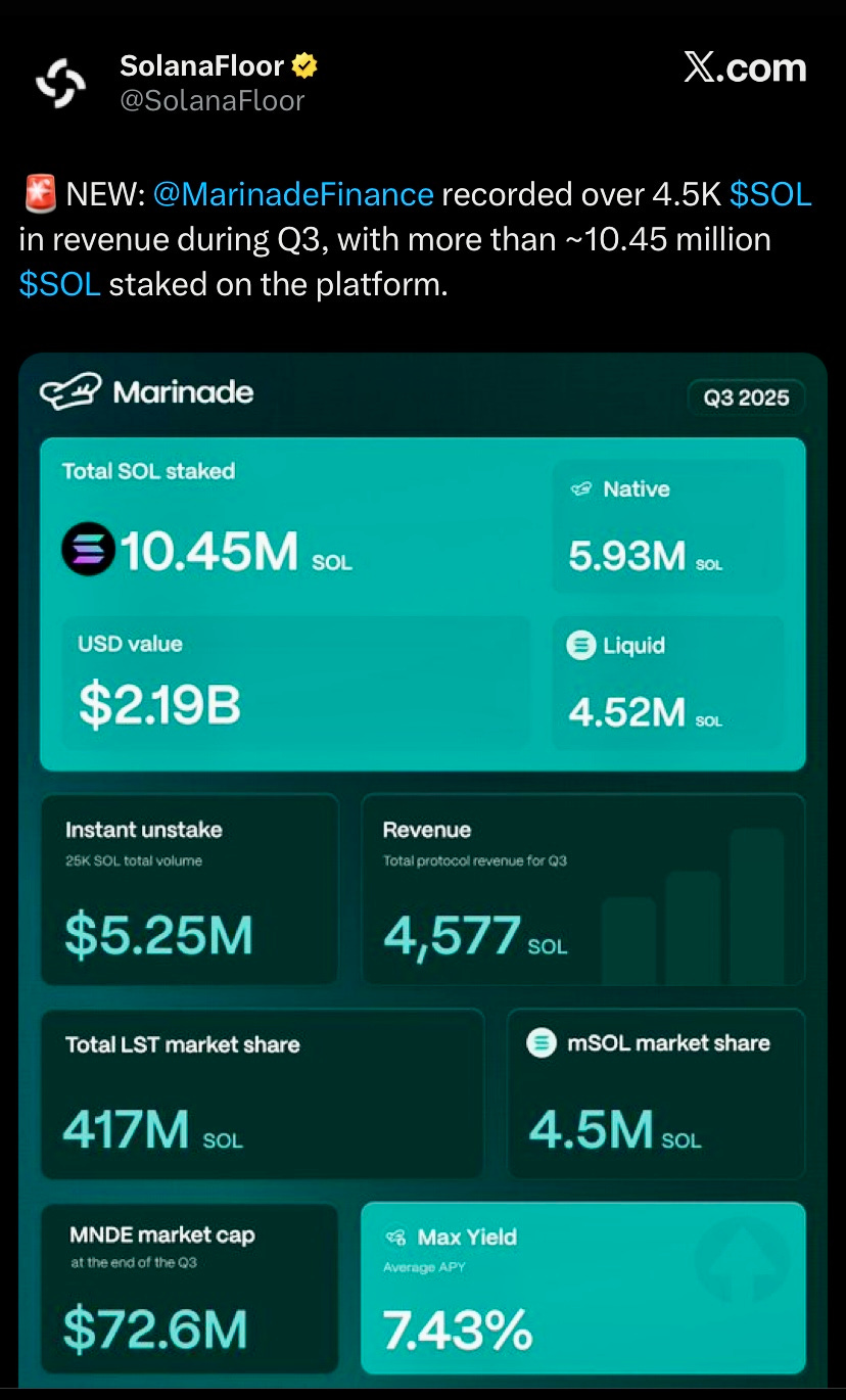 Marinade Finance earned 4.5K $SOL in Q3 revenue, with 10.45M $SOL staked on the platform.