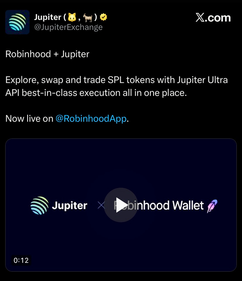 Robinhood has integrated’s Jupiter API into their wallet enabling seamless SPL token trading live on the app
