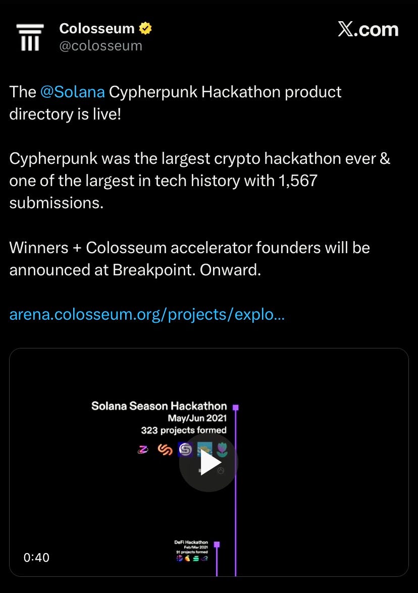 Colosseum announced the Solana Cypherpunk Hackathon went live,, dubbed the largest in crypto history with 1,576 submissions, with winners announced at Breakpoint.