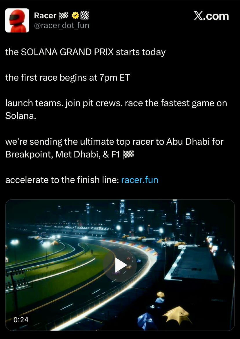 Racer dot fun opened the Solana Grand Prix, an F1-style racing event on Solana featuring daily races, team play, prizes, and $RACER rewards. The overall winner gets a fully paid trip to Abu Dhabi for Breakpoint, Met Dhabi, and the F1.