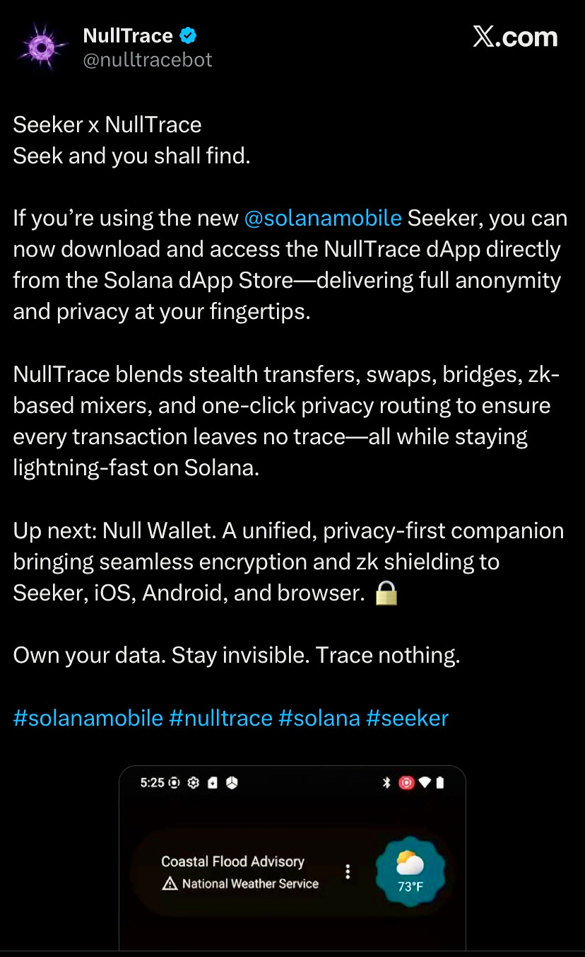 nulltracebot has released its app on the Solana Mobile dApp Store, giving users access to stealth transfers, swaps, bridges, zk mixers, and anonymous routing.