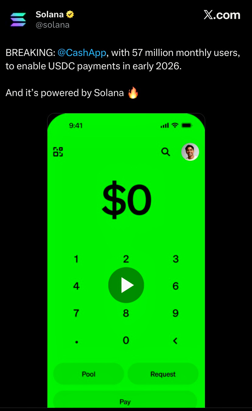 Cashapp announced they’ll launch USDC payments powered by Solana in 2026