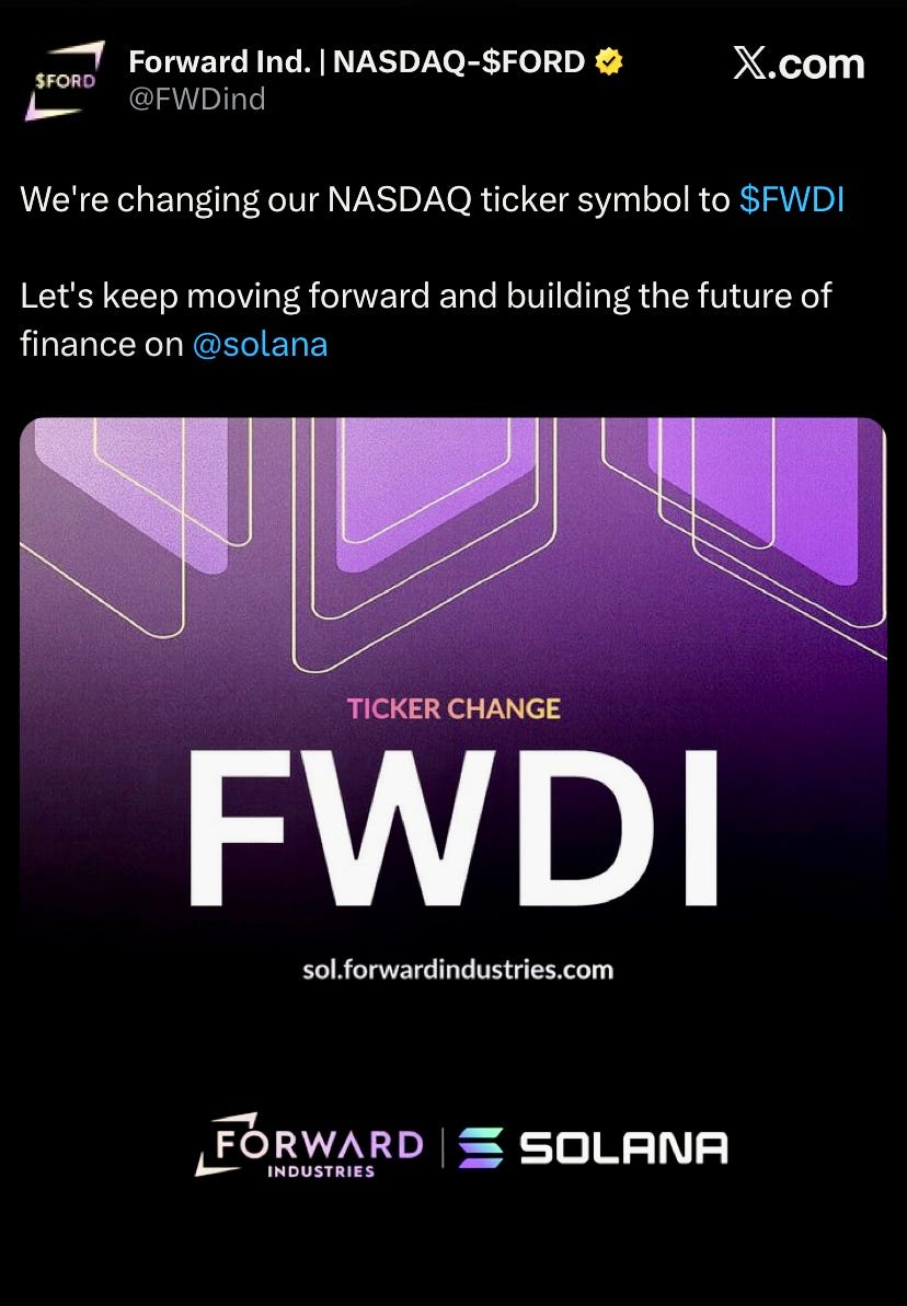 The largest Solana treasury with 6.82M SOL, FWDind, changed its Nasdaq ticker from FORD to FWDI effective Nov. 17, 2025