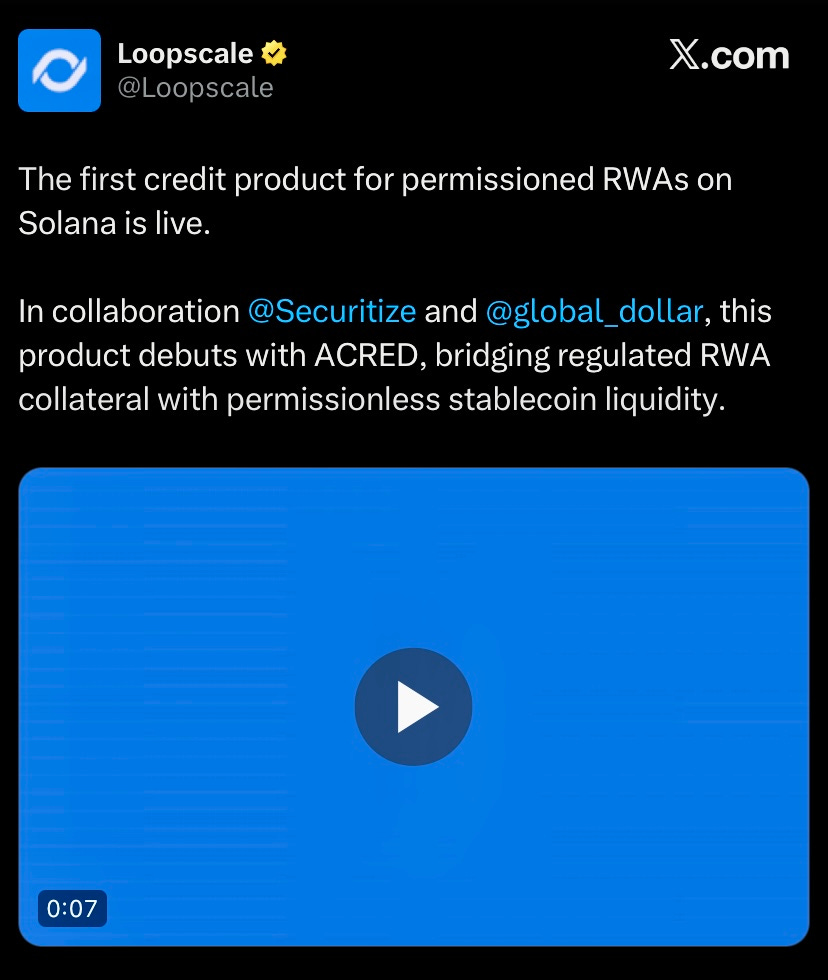 Loopscale rolled out ACRED, a permissioned RWA credit product on Solana built with Securitize and Global Dollar. It lets accredited investors borrow against tokenized Apollo credit, while stablecoin lenders earn yields backed by real-world assets.