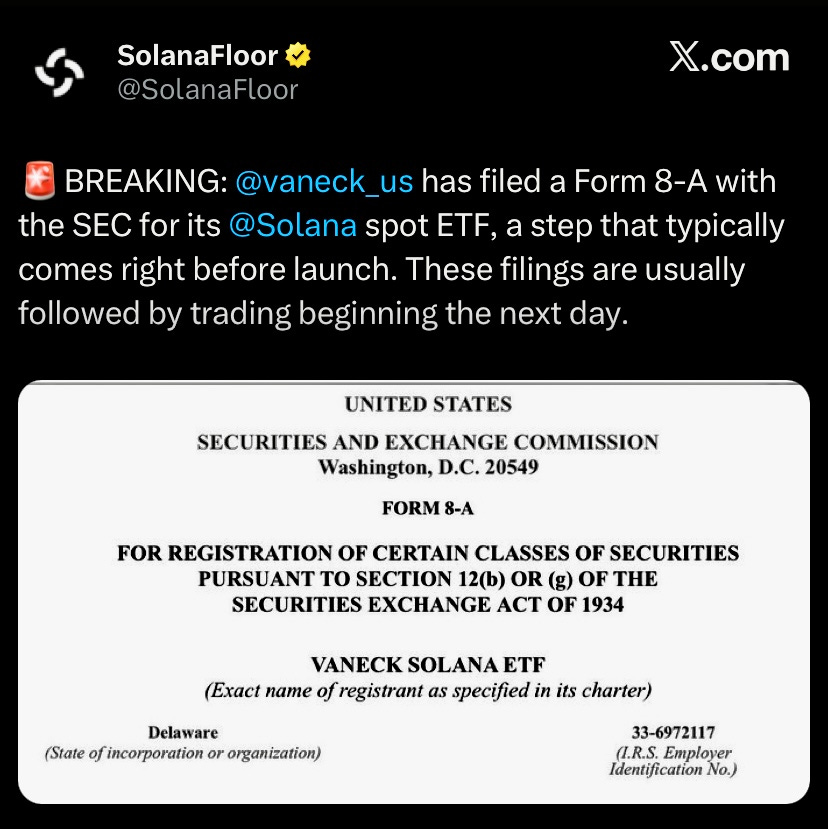 VanEck filed a Form 8-A with the SEC for its Solana spot ETF.