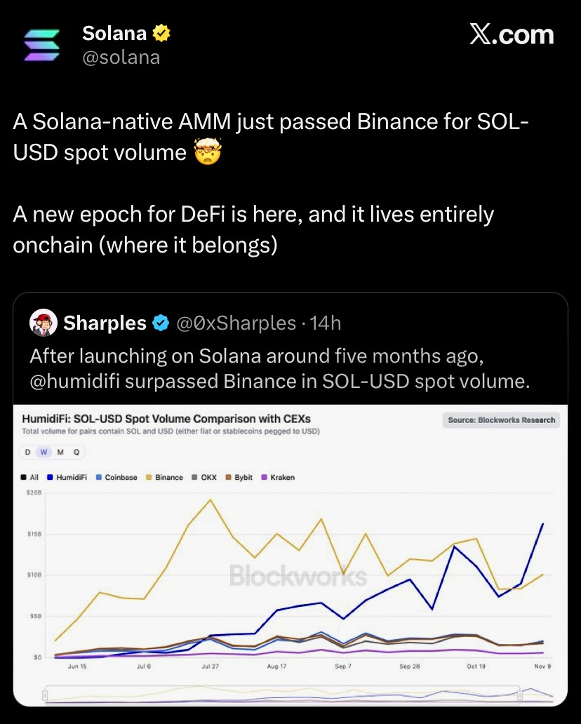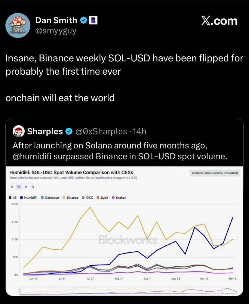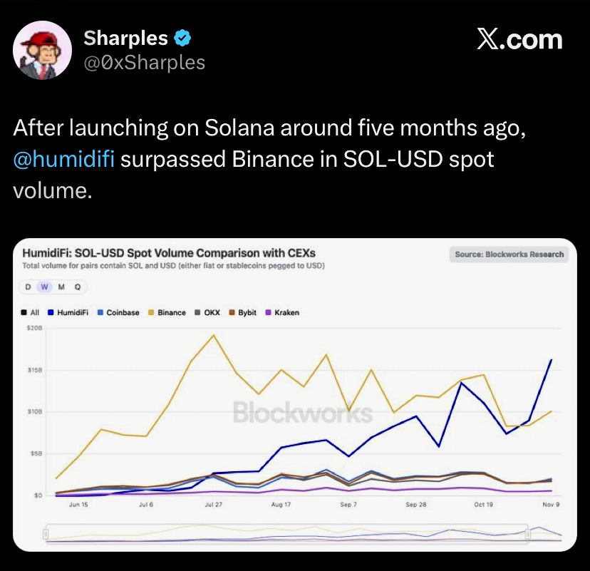 DEX Humidfi flipped Binance in SOL-USD spot volume just 5 months after launch