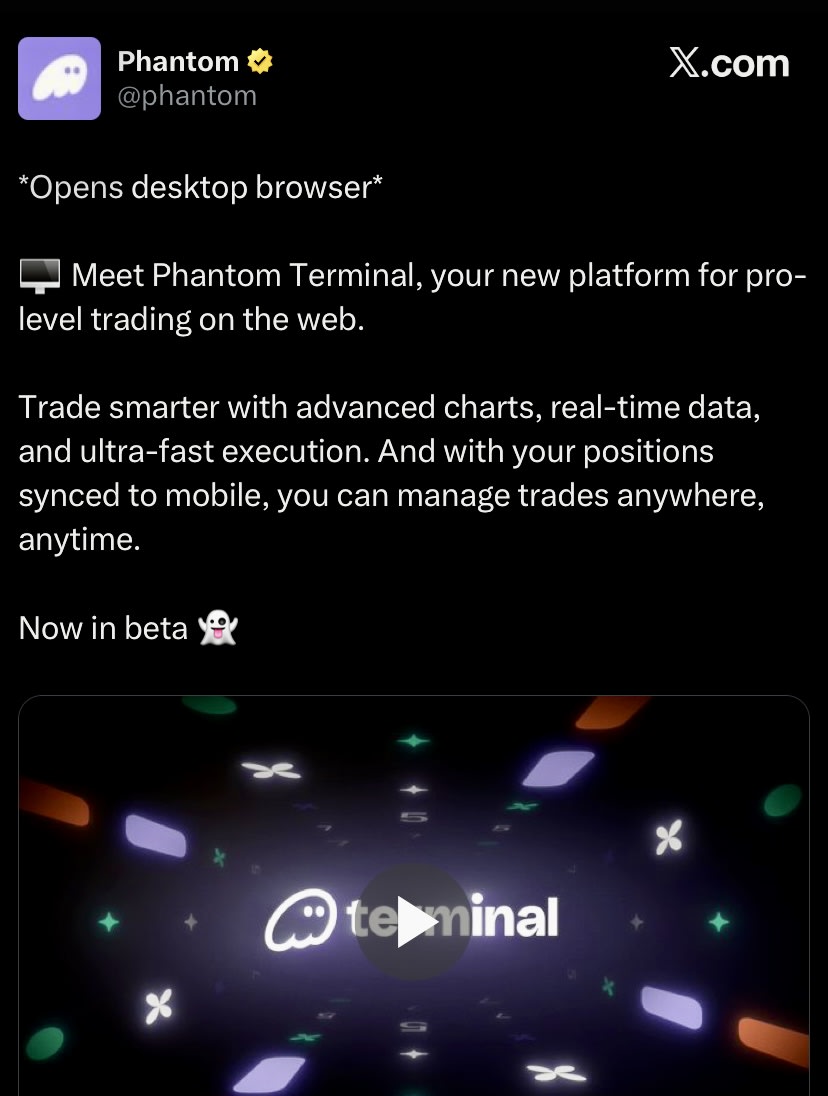 Phantom launched Phantom Terminal beta, a pro-level Solana trading platform with advanced charts, real-time data, fast execution, and cross-device position syncing.
