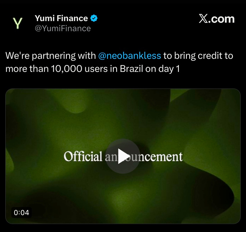 Yumi Finance partners with Neobankless to launch uncollateralized crypto credit for 10,000+ users in Brazil at launch.