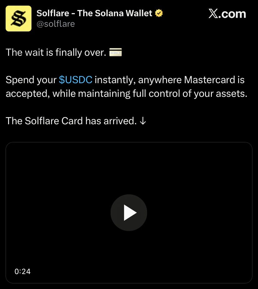Solflare rolled out self-custody USDC debit card, Mastercard-powered, instant spending from wallet, no fees or top-ups, Google Pay ready at launch.