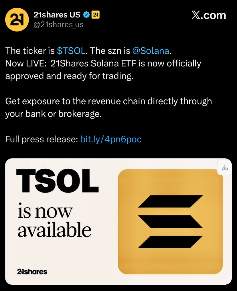 21Shares Solana ETF, $TSOL, launches on Cboe with 0.21% fee, built-in staking rewards, and $100M initial AUM.