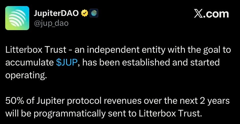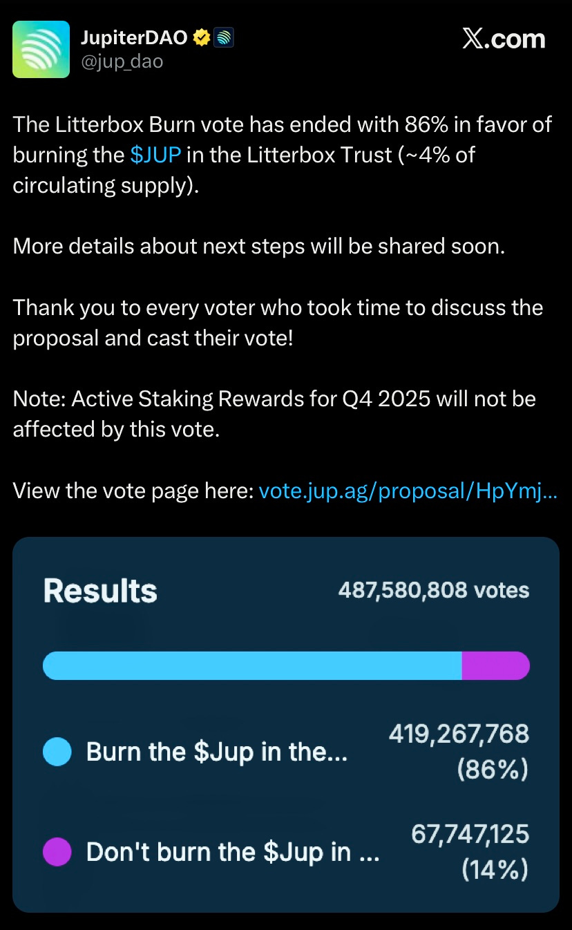 Jupiter DAO approved burning 4% of JUP supply in Litterbox Trust, an independent entity setup to accumulate JUP