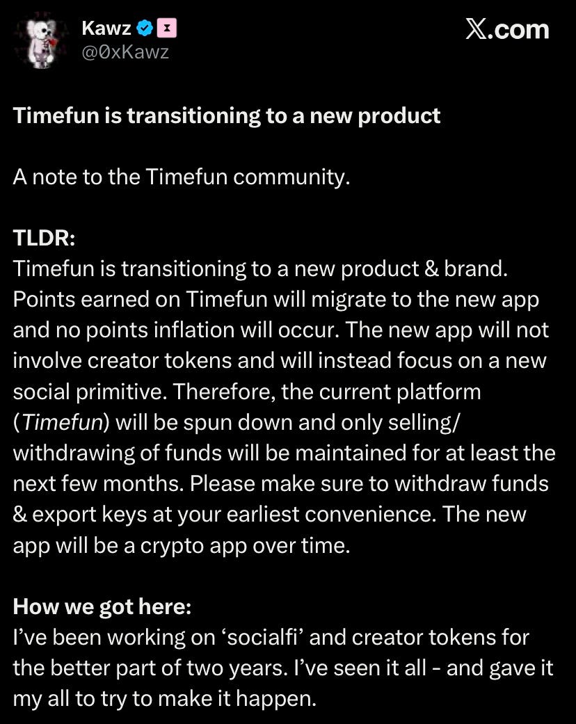 Time fun is transitioning from creator tokens to social fi existing points will migrate to the new app (no additional points issued) and trading/withdrawal will be available for a few months