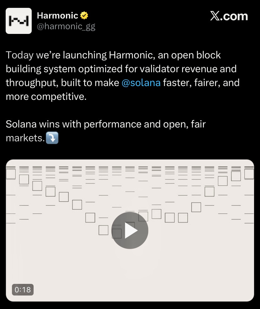 Backed by Paradigm, Harmonic launched an open block building system on Solana boosting validator revenue and fair onchain market. This will help reduce Jito monopoly