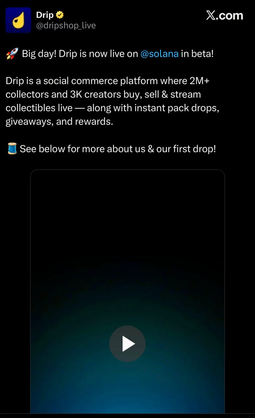 Drip launched on Solana in beta bringing 2 million+ collectors and allowing users to buy Pokémon and sports collectibles on stream