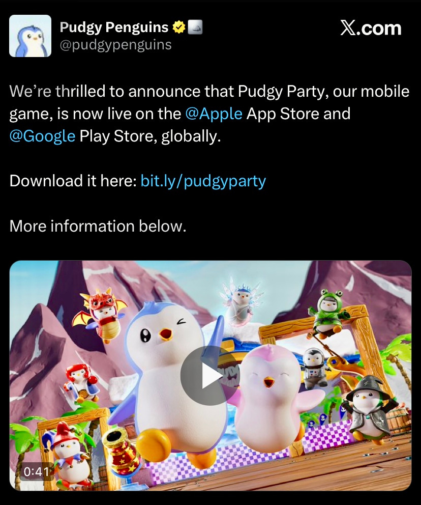 Pudgy Penguin announce Pudgy Party, a web3 mobile game built with Mythical games live on App Store and Play Store