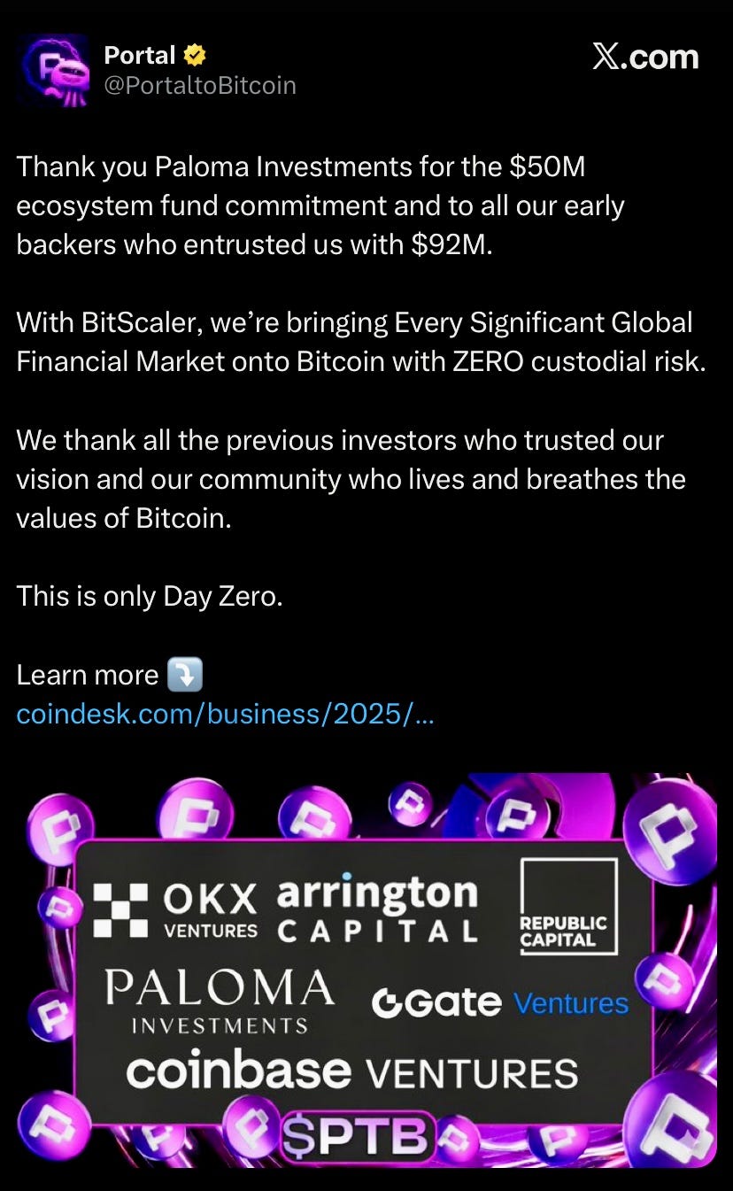 PortaltoBitcoin announced $50M ecosystem fund commitment from Paloma Investments and $92M raise from OKX Ventures, Arrington Capital