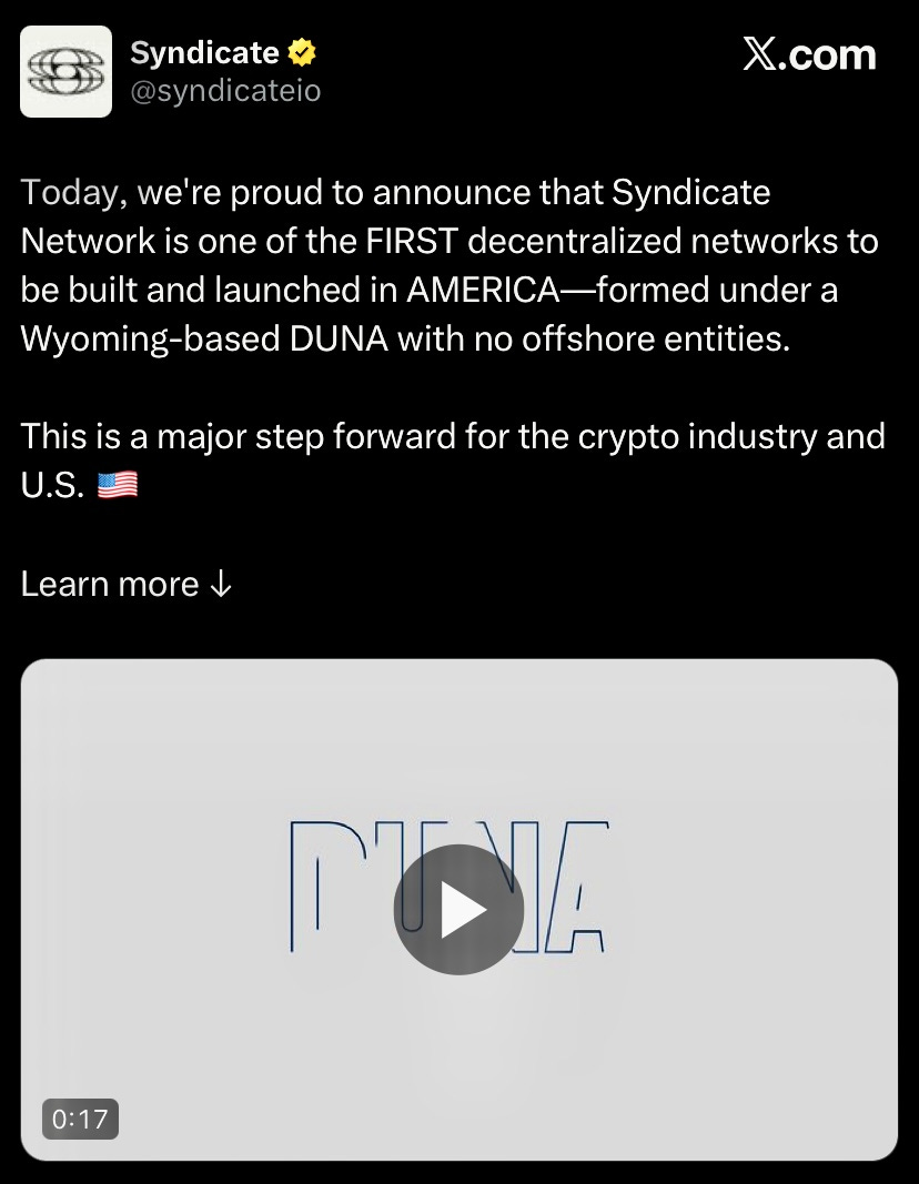 Syndicate launched Wyoming based DUNA. DUNA enables decentralized networks to comply with US law