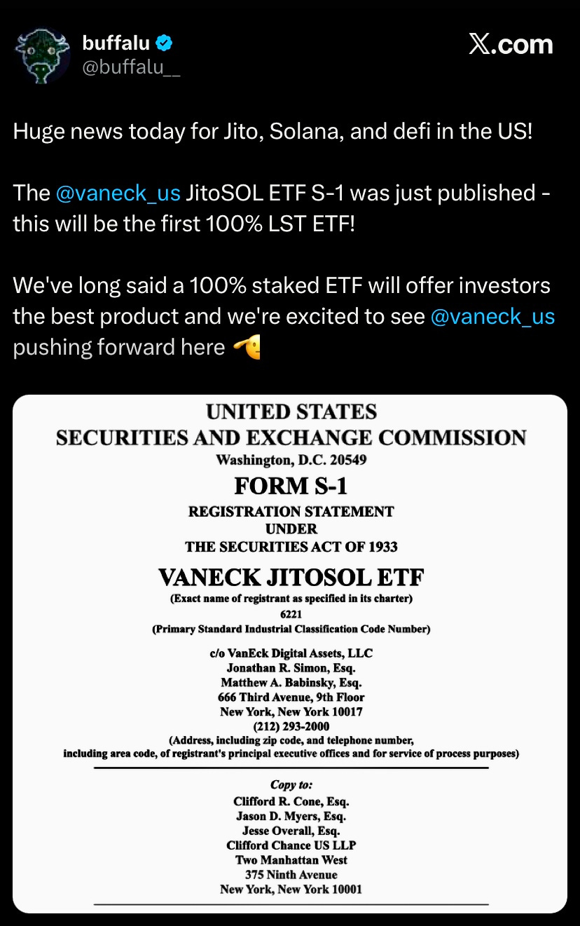 Vaneck filed for JitoSOL ETF, this comes shortly after THE SEC clarified liquid staking tokens aren’t securities