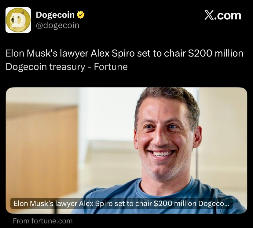 Elon Musk hired Alex Spiro to head Dogecoin $200M treasury raise