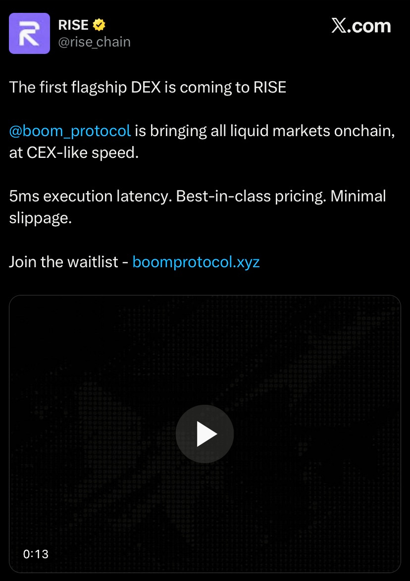 Rise chain flagship dex Boom protocol is launching soon, 5mins execution latency