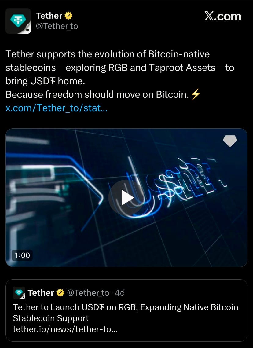 Tether to launch USDT natively on Bitcoin using RGB Protocol