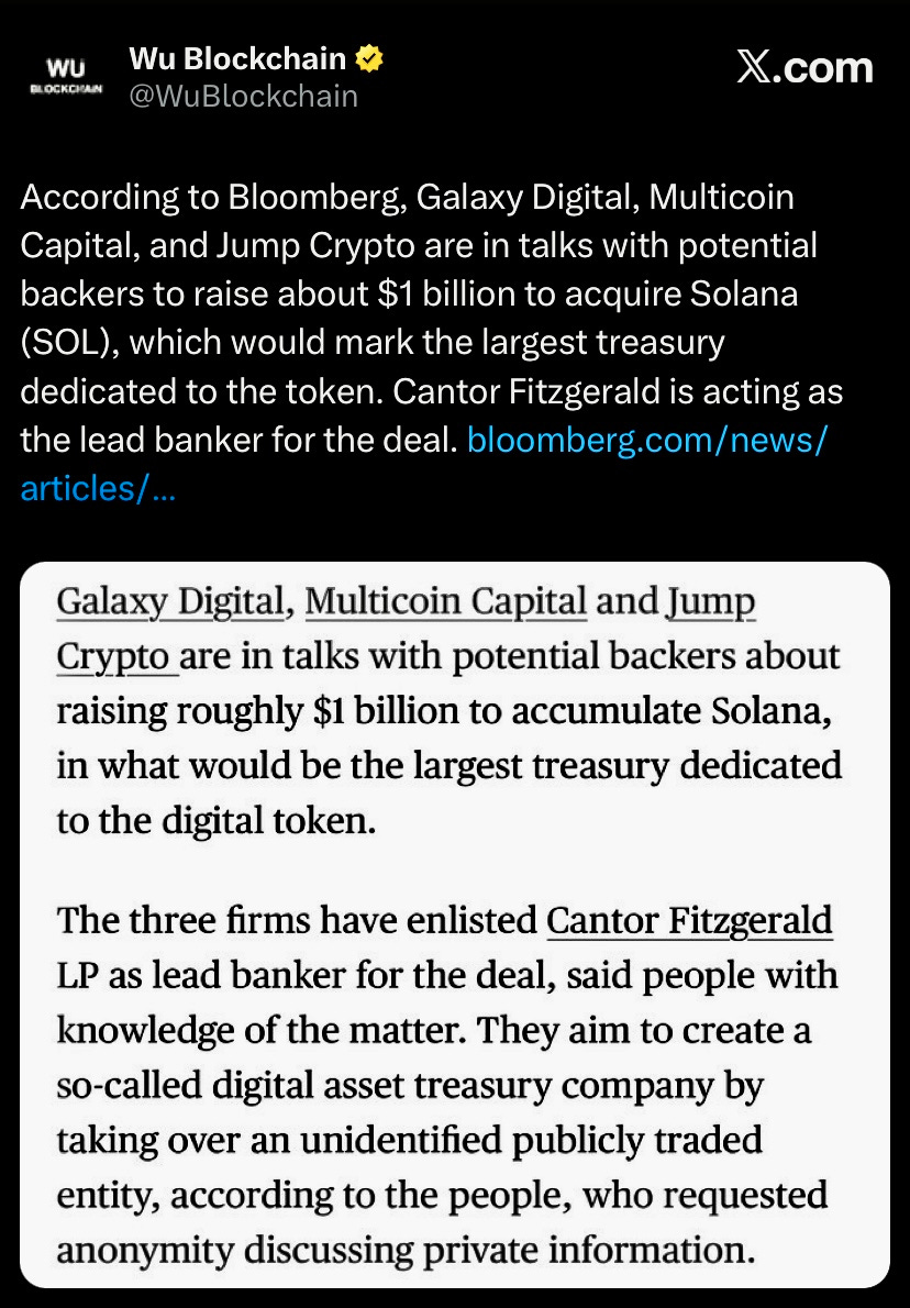 Galaxy Digital, Multicoin Capital, and Jump Crypto are in discussions to raise $1 billion to launch a corporate treasury firm focused on Solana