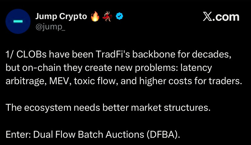 Jump Crypto introduced Dual Flow Batch Auctions (DFBA) to ‘rescue’ CLOB design, DFBA it batches trades into fair auctions, fixing MEV and latency arbitrage while unlocking liquid, lowcost markets