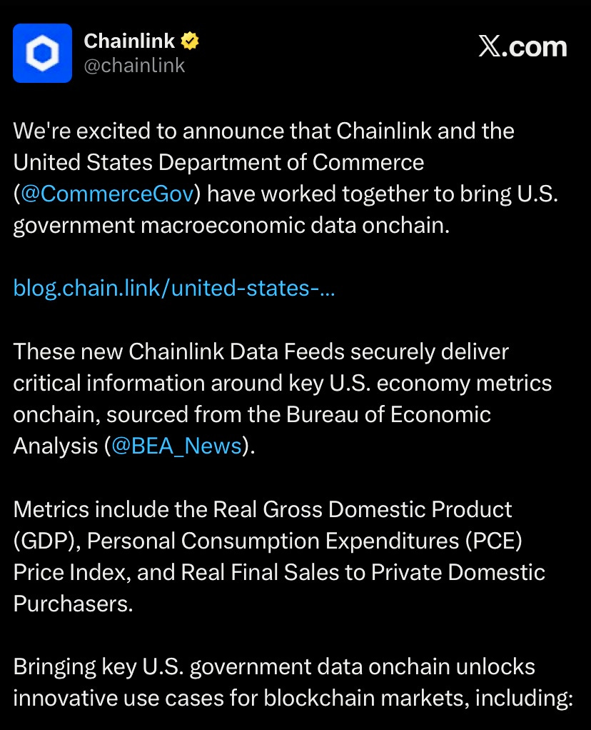 US Department of Commerce teamed up with Chainlink to publish government macroeconomic data such as GDP and Inflation onchain.