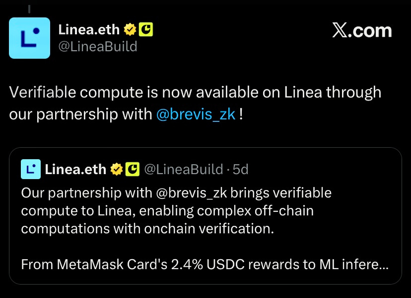 Verifiable zk compute, solves complex onchain computation is now live on Linea thanks to Brevis zk