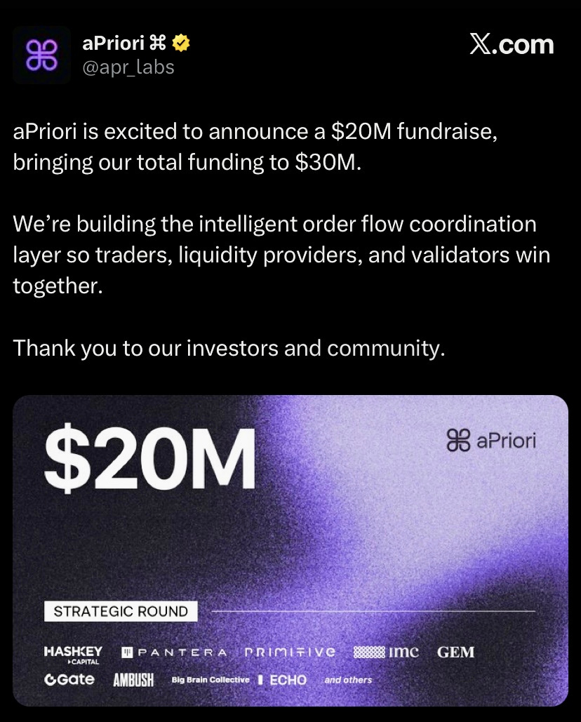 Onchain markets Execution layer, aPriori raised $20M from Haskey Capital, Pantera, totaling $30M raised so far
