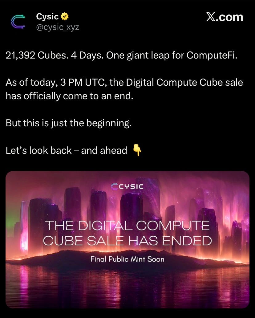 Cysic completed their Digital Compute Cube sale with 21,392 cubes sold