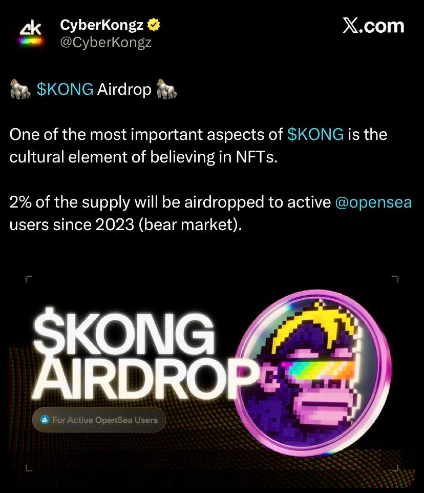 CyberKongz NFT announce KONG token airdrop to 2% of active OpenSea users who who purchased $10k worth of NFTs since Jan 1, 2023