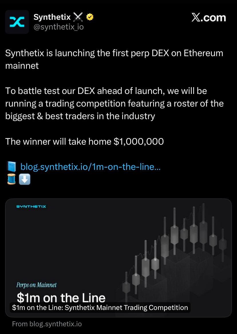 Synthetix will launch a $1M trading competition on its perp DEX on Ethereum mainnet starting October 202