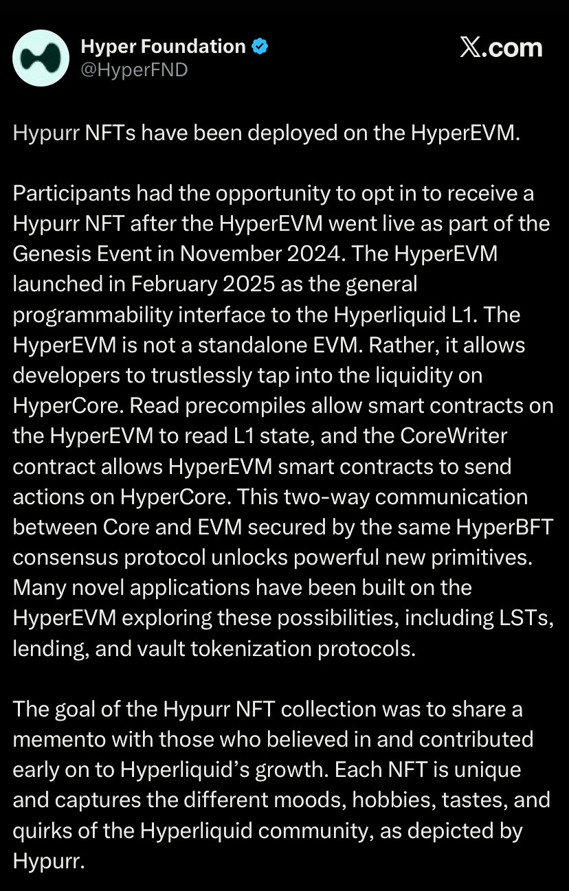 Hyperliquid distributed Hypurr NFTs on their HyperEVM chain