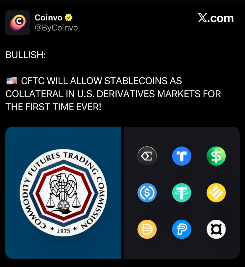 The CFTC launched an initiative to let traders use tokenized collateral like stablecoins in derivatives markets