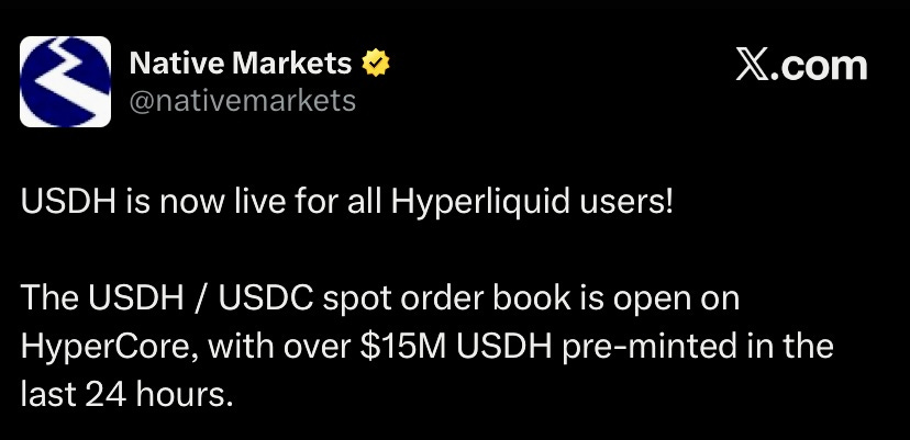 Hyperliquid native stablecoin by USDH is live on mainnet.