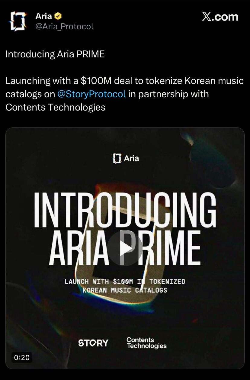 Aria Prime launched a $100M deal to tokenize Korean music catalogues on Story Protocol
